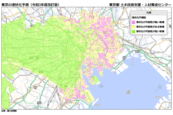 初出:東京都土木技術支援・人材育成センター 埋立地や湾岸エリアの豊洲、晴海、東雲エリアや羽田空港辺りが、液状化の可能性が高い地域になるようです。