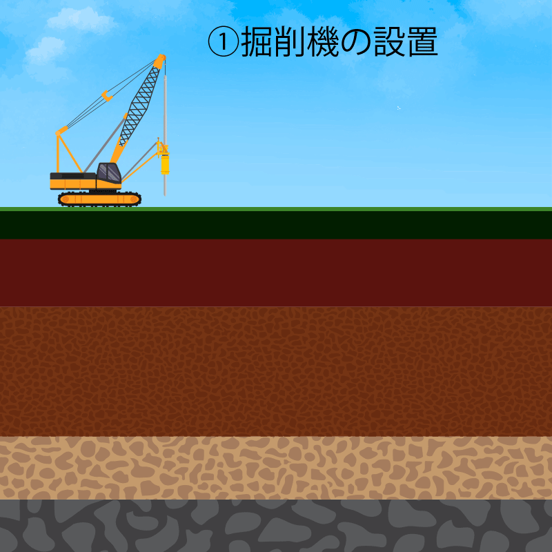 造成杭で一般的なのは「アースドリル工法」という工法で、アースドリル機を使い地面を掘削し、杭をつくります。