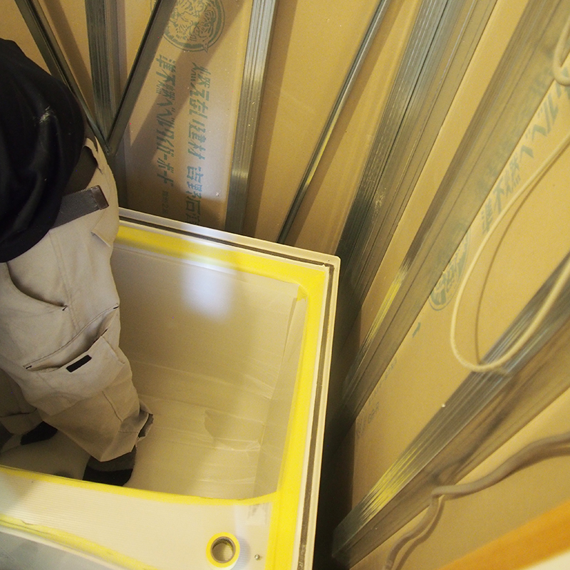 工事当日は私も立会い、作業を確認させてもらいました。浴室の鏡や水栓を一旦取り外し、壁パネルを3面外した後で浴槽部分も取り外されて浴室がほぼバラバラの状態です。