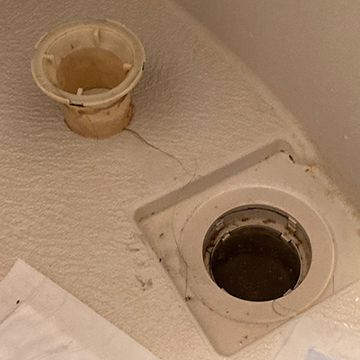 なんと浴室洗い場の排水口にあるトラップと呼ばれる部分に亀裂が入っていたのです。