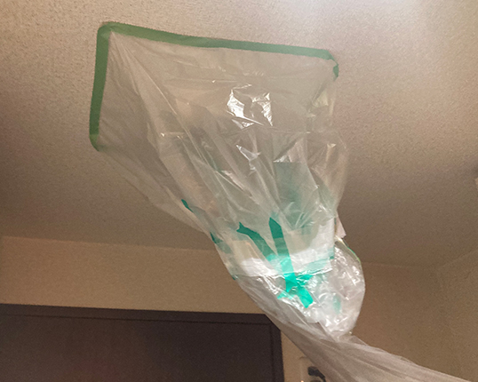水漏れが起こった際の受け皿に使用するバケツを持っていき、天井にマスカーというマスキングテープにビニールのついたものを筒状にし、水をキッチンシンクまで流す様に養生を行いました。