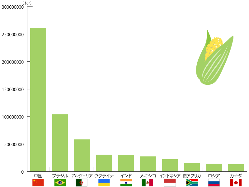 国際連合食糧農業機関(FAO)による調査では、2020年の小麦の生産量はロシアが3位、ウクライナが8位です。トウモロコシの生産量は、ウクライナが4位、ロシアが9位となっています。