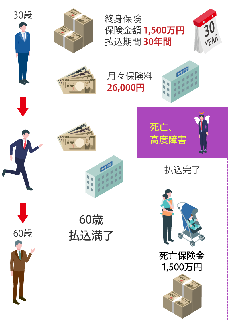 60歳払込満了の保険に加入。死亡の場合、1,500万円の保険金が支払われます。